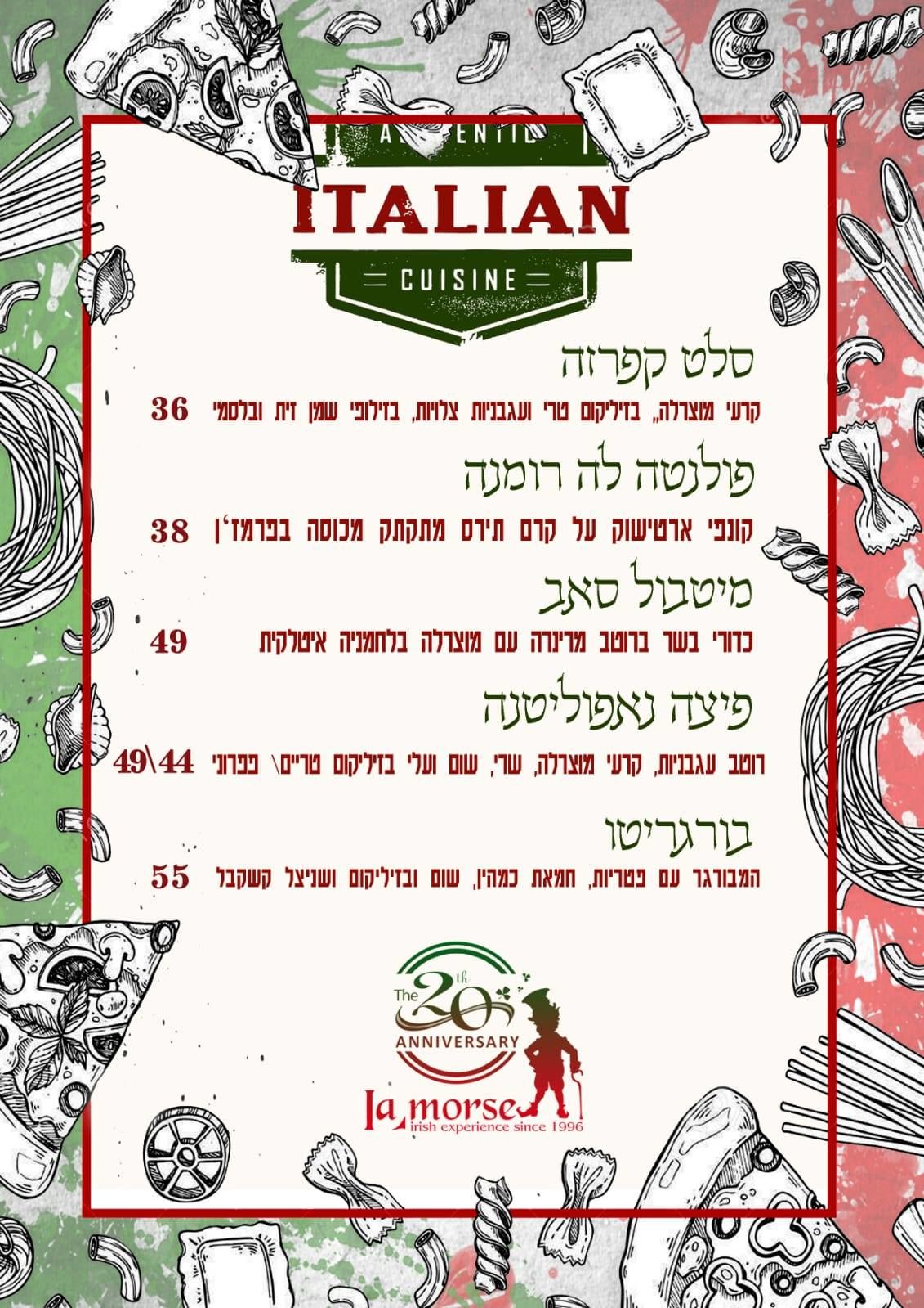בנוסף, החודש (אוגוסט), במסגרת הסיבוב העולמי של הפאב (כל חודש מביאים מטבח ממדינה אחרת) התחיל החודש האיטלקי- בכל יום שני בחודש הקרוב, המטבח של ה'לה מורס' יהפוך לאיטלקי עם מנות מיוחדות הישר מאיטליה. אז מה תפריט?