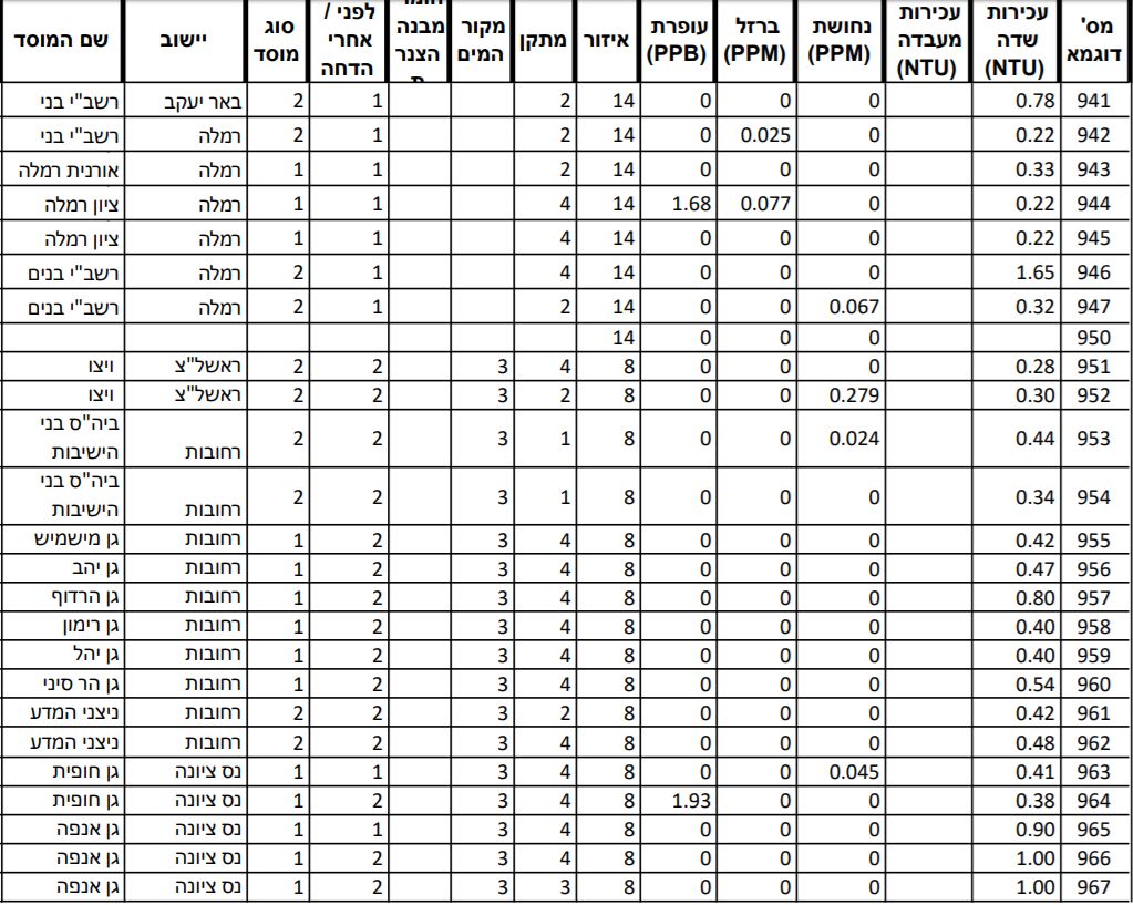 משרד הבריאות פרסם השבוע את תוצאות בדיקת איכות המים לשנת 2018 במוסדות החינוך. במהלך שנת 2018 לקח המשרד 1379 דגימות מים מבתי ספר, גנים ומעונות ברחבי הארץ. בבדיקות נבדקו הימצאות של מתכות במי השתייה כמו עופרת, ברזל ונחושת. כמו כן נבדקה עכירות המים. על פי הבדיקות נמצאה התאמה בין עכירות המים לבין המצאות מתכות במים. בסיכום הבדיקות כי 99% ממי השתייה במוסדות החינוך בישראל נמצאו בטוחים לשתייה.