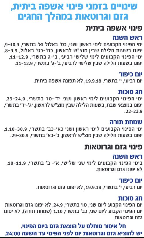 משרדי העיריה יהיו סגורים לקבלת קהל ולא יינתן מענה טלפוני בערב ראש השנה(9.9-11.9), ערב יום כיפור (18.9-19.9), ערב סוכות וימי החג עצמם- החל מיום ראשון, 23.9 ועד לאחר החג.