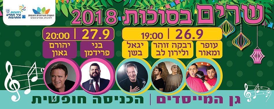 אחרי חופשת קיץ עמוסה במופעים ופעילויות לתושבי רחובות , החברה העירונית ממשיכה לעבוד ומזמינה את התושבים להגיע למופעי "שרים בסוכות 2018" שיתקיימו במשך יומיים בגן המייסדים. מופעי שרים בסוכות הפך למסורת ומתקיים זו השנה השלישית עם הופעות של יהורם גאון, יגאל בשן, רבקה זוהר ולירון לב ועוד