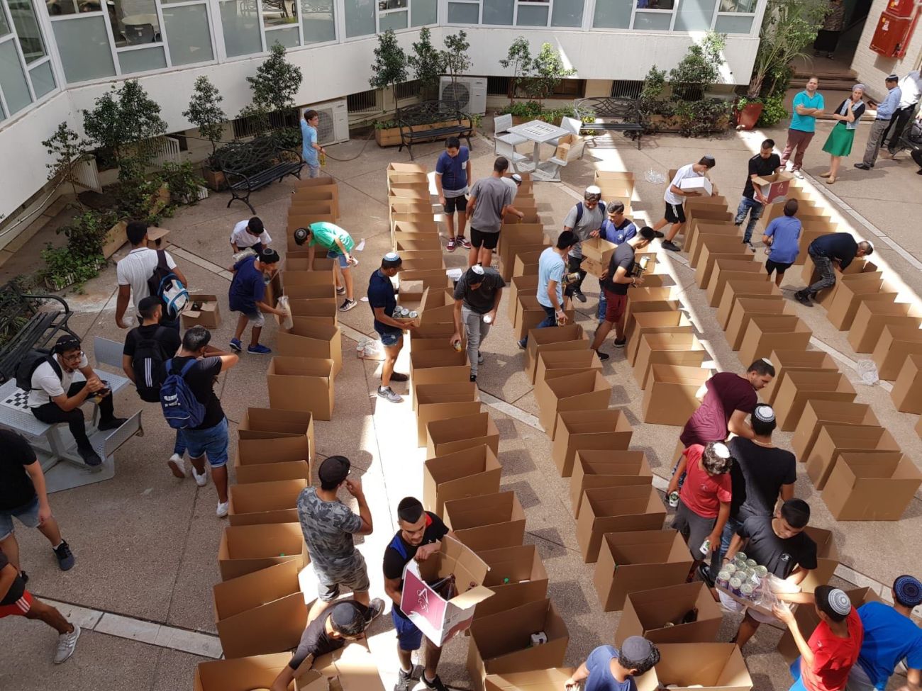השבוע הפכה כוסתה חצר בית הספר בארגזים ומוצרי מזון והתלמידים בראשות המחנך נתי פרץ ארזו 250 חבילות מזון שיועברו לחלוקה למשפחות ברחבי העיר
