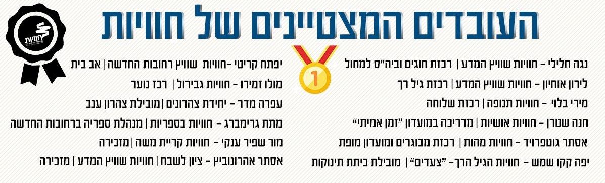 נבחרו 12 העובדים המצטיינים ברשת חוויות: נגה חלילי, לירון אוחיון, מירי בלוי, חנה שטרן, אסתר גוטפרויד, יפה קקו שמש, מתת גרימברג, מור שפיר-ענקי, מולו זימרו, אסתר אהרונוביץ', יפתח קריטי ועפרה מדר