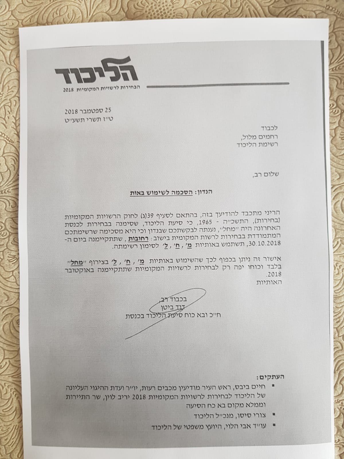 מצורף מכתב האישור של ח"כ דוד ביטן לרחמים מלול המתיר שימוש באותיות "מחל"