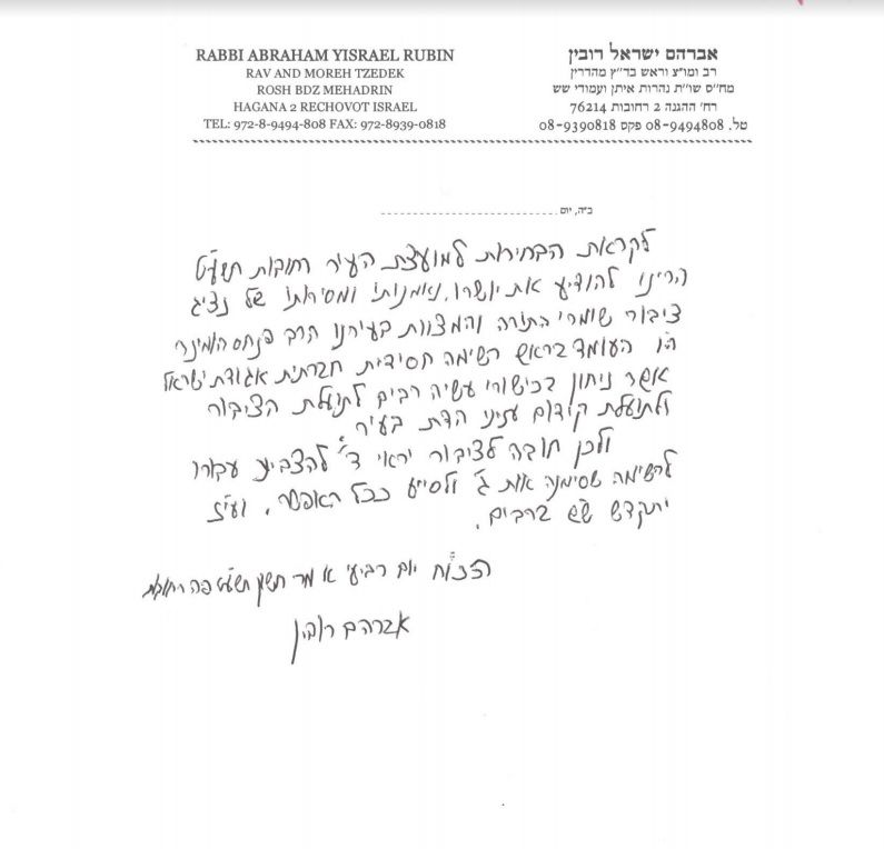 חיזוק לרב פנחס הומינר! הרב אברהם רובין שליט"א פרסם מכתב הקורא לציבור להצביע עבור פנחס הומינר ראש רשימת אגודת ישראל ברחובות (סימנה ג')