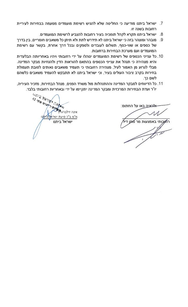לא כך במקרה דנן היות ורחובותי לא זוכה למימון מישראל ביתנו אלא בתמיכה של ציבור בוחריה. הנושא כאמור נבדק מול וועדת הבחירות והיות ומאחר ואין כל הסכמי מימון בין הצדדים הרי שלא נדרשו להצגת ההסכם, למרות זאת, בחרו שני היו"רים לחשוף לציבור את ההסכם בין הצדדים.
