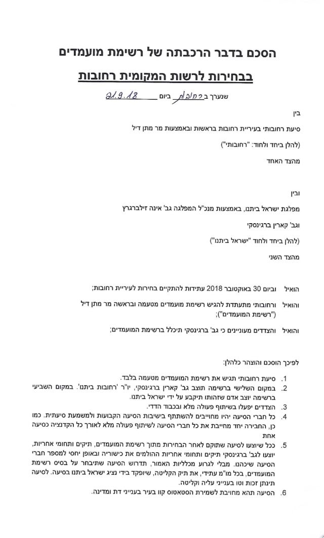 "אנחנו מאמינים בשקיפות ולכן למרות שלא נדרשנו ואף יתרה מכך, בדקנו מול משרד הפנים וועדת הבחירות האם אנחנו צריכים להציג את ההסכם בינינו ונעננו בשלילה, היות ואין כאן באמת איחוד בין סיעות מכיוון שרחובותי היא הסיעה שמממנת את הקמפיין והיא זו הרשומה בפני ועדת הבחירות. למעלה מן הצורך אנחנו מציגים את ההסכם בשלמותו לעיון הציבור."