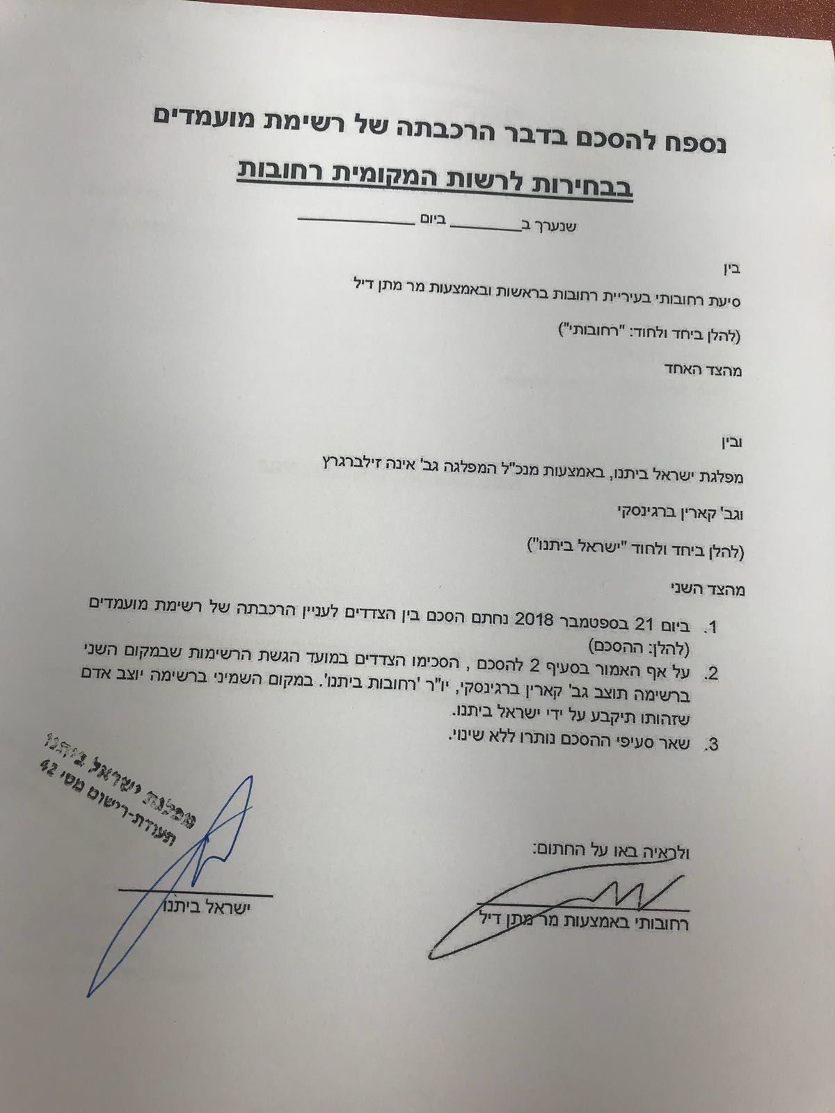 על פי חוק הבחירות תנועת "רחובותי" בראשות מתן דיל לא הייתה חייבת להציג את ההסכם לציבור מאחר שלא מדובר בהסכם שיש בו מימון של מפלגת ישראל ביתנו אלא רק הסכם תמיכה. צילום ההסכם בתחתית הכתבה