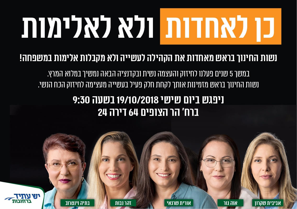 לאור ריבוי מעשי הרצח של נשים, נשות רשימת "החינוך בראש" (אווה גור, אביבית שקרון, אורית שרגאי, זהר נבות ובתיה וינטרוב) בראשות זהר בלום יקיימו בשישי 19/10 ברחובות ההולנדית כנס נשים "כן לאחדות לא לאלימות"