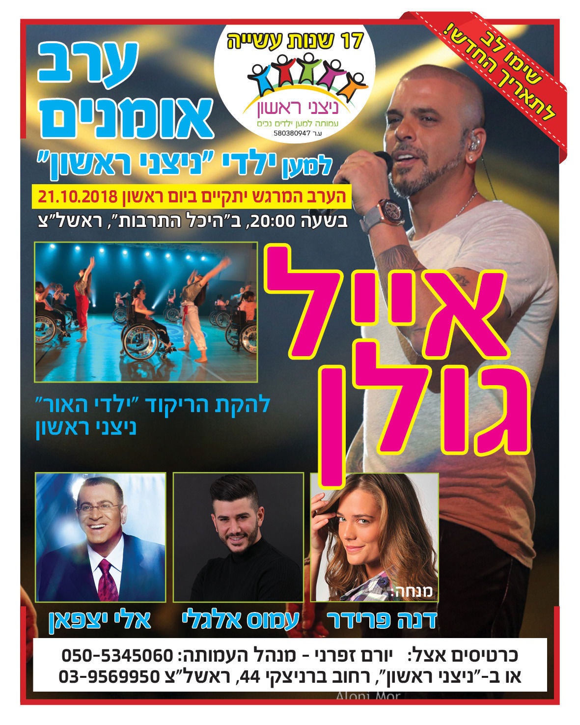 השבוע התקיים בראשון לציון ערב התרמה למען עמותת "ניצני ראשון" המסייעת לילדים נכים הלוקים בשיתוק מוחין בהשתתפות אמנים רבים ובהם אייל גולן ואלי יצפאן.