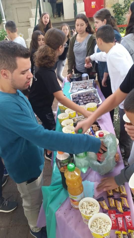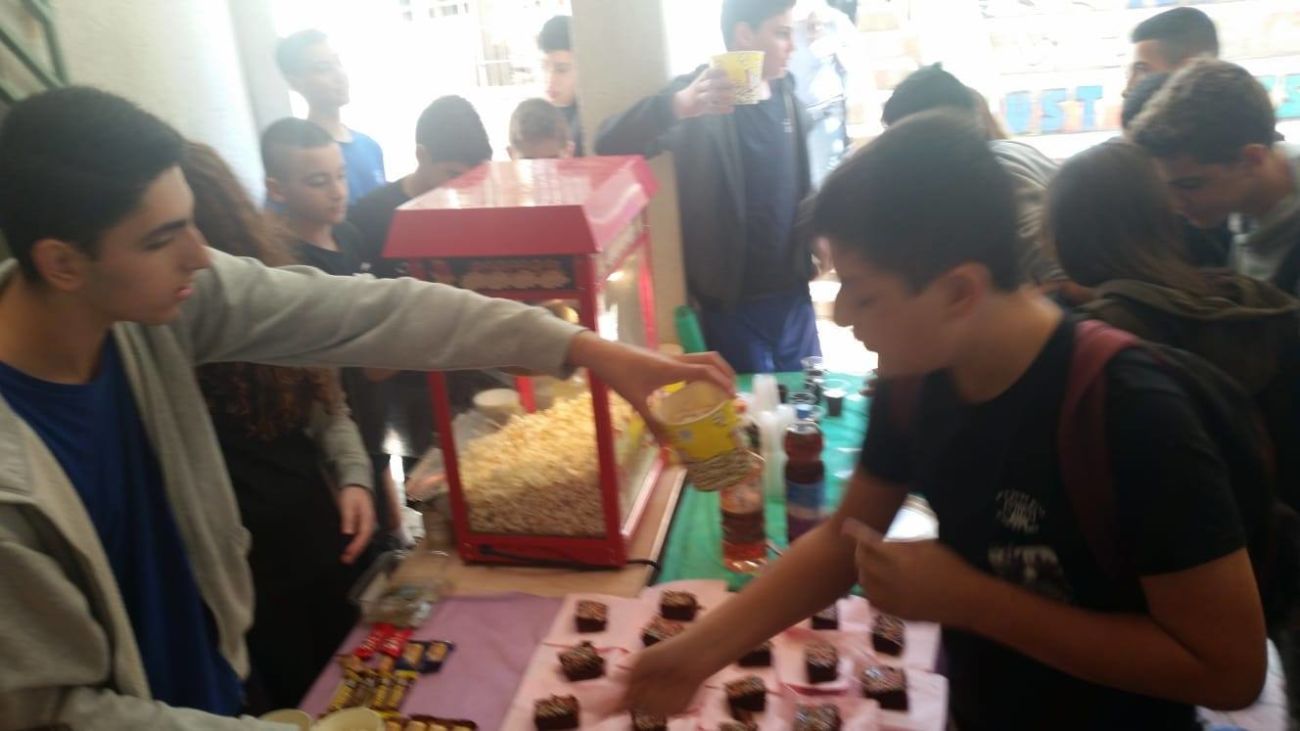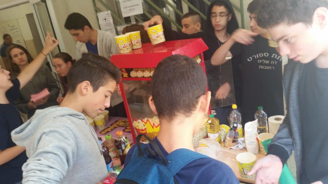 תלמידים בשיתוף המורה מיכל קיימו יריד אוכל לתלמידים בזמן ההפסקה בה מכרו פופקורן, שתייה ודברי מאפה
