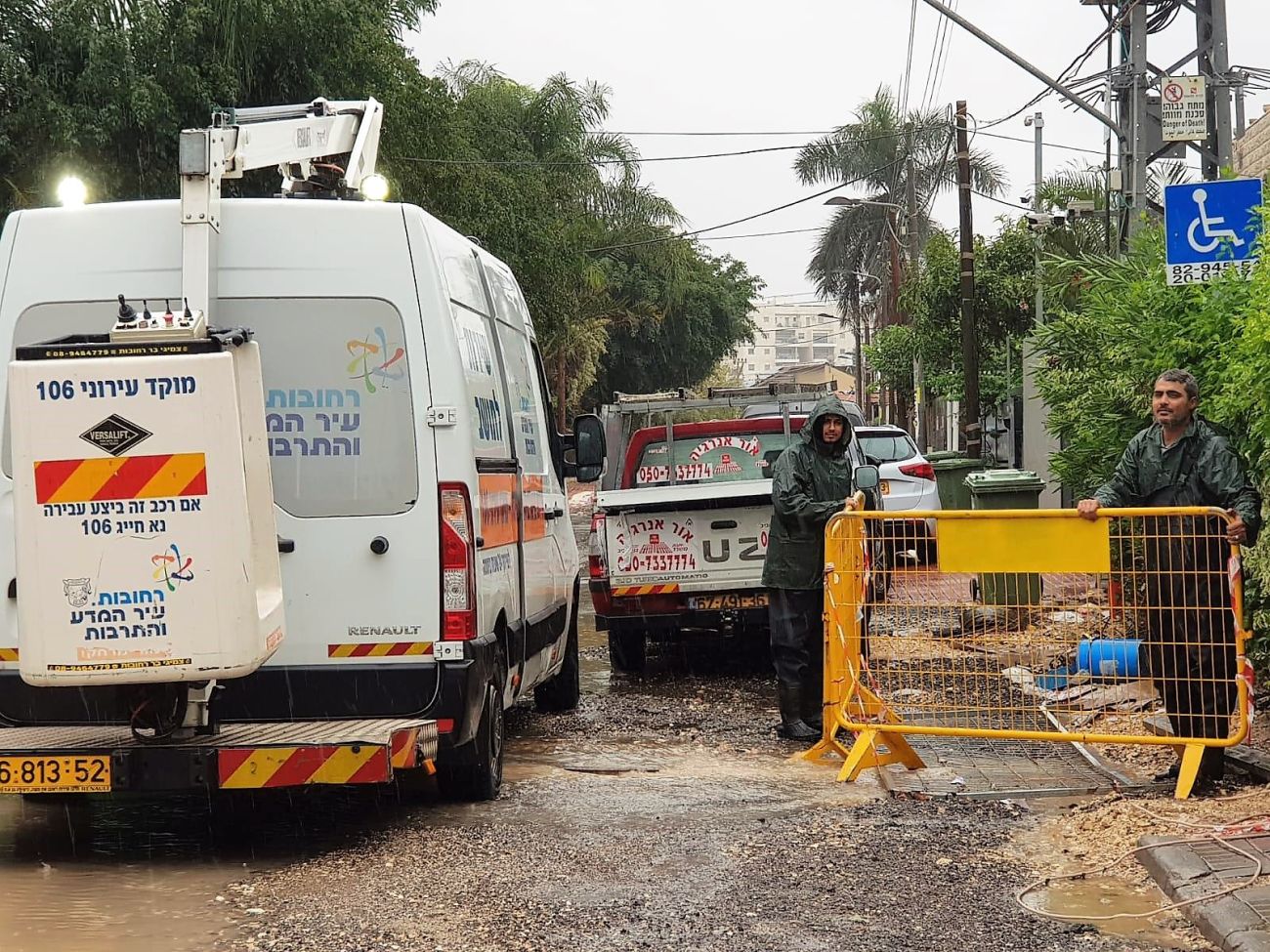 בגשם ובמים עבדו עובדי עיריית רחובות כדי להכין את רחובות לשבת לאחר "מבול" של גשם ו"מבול" של 1500 קריאות (פי 3 מיום רגיל) וכעת נערכים לגשם האמור להתחדש בערב ולילה
