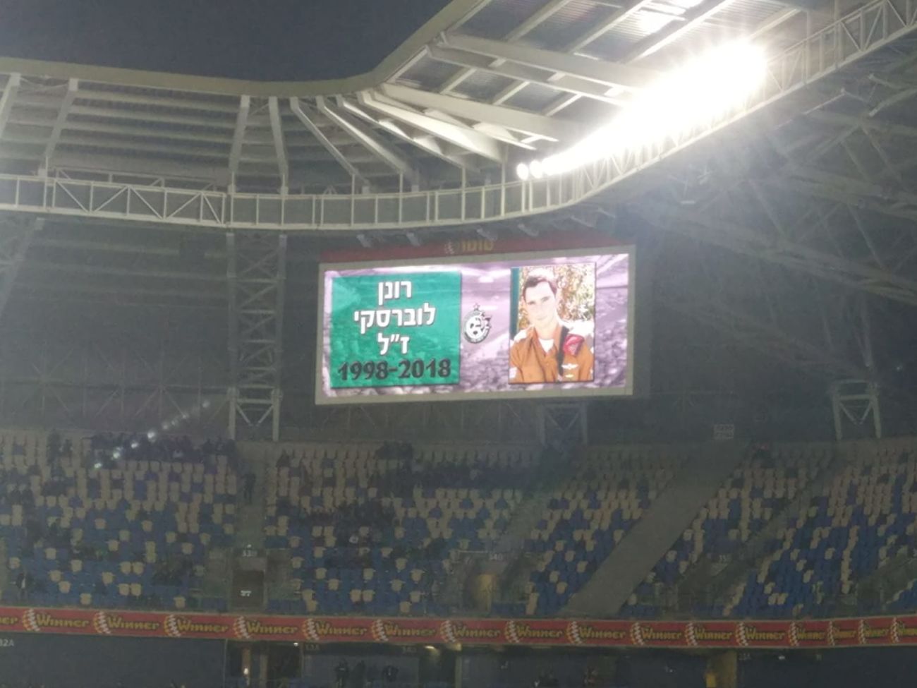הערב מתקיים משחק הכדורגל בין מכבי חיפה למכבי תל אביב. החייל רונן לוברסקי ז"ל מרחובות אשר נפל בפעילות מבצעית ברמאללה היה אוהד מכבי חיפה. והערב, החליטו במכבי חיפה להזמין את בני המשפחה כאורחי הכבוד ולפני המשחק כמחווה נתלה שלט ענק לזכרו של רונן ז"ל
