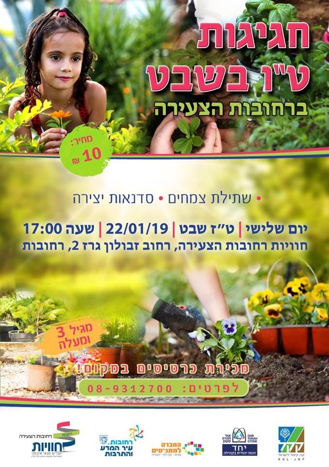 וביום שלישי 22.1 החל מהשעה 17:00 יתקיים בחוויות רחובות הצעירה חגיגת נטיעות ,סדנאות אמנות הכנת ראש דשא שירים וריקודים לכל המשפחה .