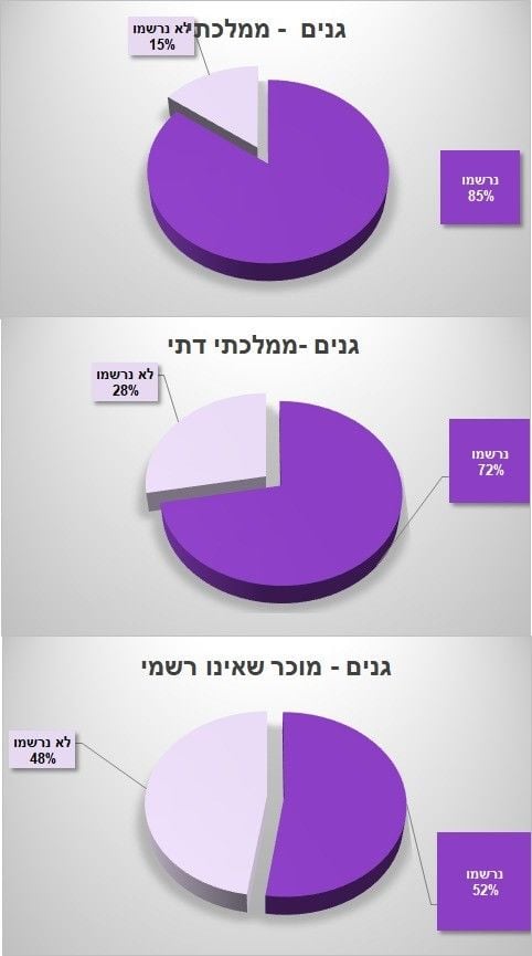 מקרב גני הילדים הממלכתיים דתיים נרשמו 72% מהילדים זכאי הרישום.