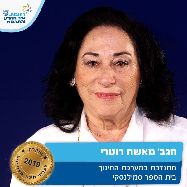 מאשה עבדה במערכת החינוך 48 שנה ובבית ספר סמילנסקי 40 שנה. במהלך השנים הייתה מחנכת כיתה בכל שכבות הגיל ולאחר פרישתה לגמלאות החליטה להמשיך ולתרום למערכת החינוכית. בזכות התנדבותה, ספריית בית הספר פעילה ונושמת. מאשה מקדישה את עצמה לעשייה מבורכת וחשובה של עידוד קריאה וחיבור הילדים לעולמות תוכן חדשים ומרתקים. במסגרת התנדבותה הקימה וועדת נאמני ספרייה שמסייעים לה בניהול המקום, מעצימה את התלמידים ומנהלת איתם שיח בעקבות קריאה. על זאת ועוד מאשה מצטיינת חינוך תשע"ט.