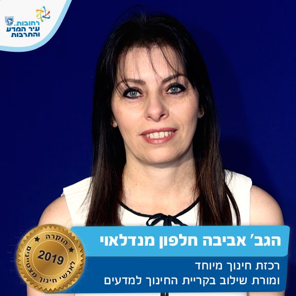 רכזת חינוך מיוחד ומורת שילוב בקריית החינוך מדעים. אביבה היא אשת חינוך רבת אשכולות ופעלים ומעוררת השראה, בעלת חזון ומעוף, מהווה דוגמא אישית מתוך מסירות וצניעות. אביבה מובילה את תחום החינוך המיוחד בביה"ס, תוך גילוי מקצועיות רבה, פדגוגיה מיטבית, מחויבות ומיקוד במטרה ופועלת ללא ליאות לקידום יוזמות חדשות מסייעת למורים במציאת דרכים יצירתיות ומגוונות ליצירת מוטיבציה אצל תלמידים מתקשים ובעיות משמעת. על זאת ועוד אביבה מצטיינת חינוך תשע"ט.