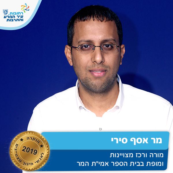 מורה למתמטיקה בבי"ס אמית המר המוביל את תלמידיו ל 100% הצלחה, תוך השקעה רבה והבאת תלמידים מוחלשים להיבחנות ברמה המקסימלית. כמו כן היה שותף בהעלאת ביה"ס במבחני המיצ"ב. כרכז מצוינות הוביל ויזם תחרות "תורה ומדע", שכללה כתיבת עבודות המשלבות ממשקים בין קודש לחול. יוזמה זו הפכה להיות ארצית ועיקרה הוא קירוב לבבות בין תלמידים מהחמ"ד והממלכתי. על כך קיבל מצטיין רשת אמי"ת. אסף ליווה תלמידים כהכנה לחידון התנ"ך העולמי, בנוסף, הוביל את תחום הרובוטיקה וגרף 2 גביעים, זכייה בחידון היסטוריה, תחרויות ריצה ועוד. על זאת ועוד אסף מצטיין חינוך תשע"ט.