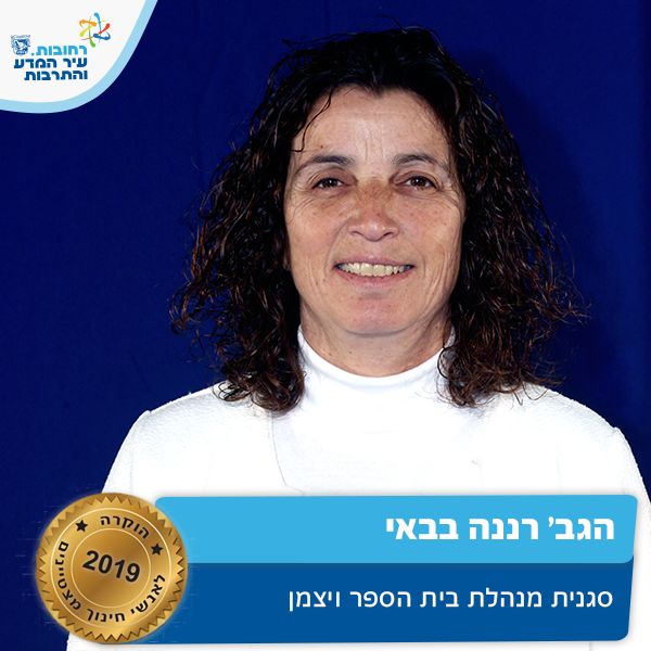 רננה עובדת בביה"ס ויצמן מזה כ 25 שנה ושימשה בתפקידים רבים ומגוונים, בשנתיים האחרונות מתפקדת כסגנית שנייה. ומעורכת מאוד ע"י הצוות, הורים ובעיקר תלמידים. לרננה יכולות מנהליות ולוגיסטיות גבוהות, הינה בעלת יוזמה, חרוצה, ואקטיבית. רננה היא בעלת חזון ומעוף בראייה עתידית להוביל את ביה"ס בתחום הספורט. על זאת ועוד רננה מצטיינת חינוך תשע"ט.