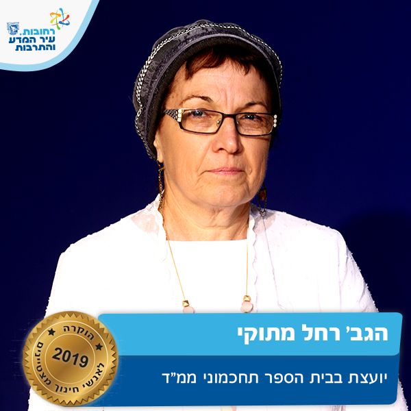יועצת בי"ס תחכמוני. רחל כתובת ואוזן קשבת לתלמידים, הורים וצוות ביה"ס, מכוונת את בוגרי כיתות ו' ברגישות ובמקצועיות למסגרות המשך וקולטת בחום ואהבה את ילדי הגנים, כדי לדאוג לשילובם המיטבי בכיתות א', מלווה תלמידים המגלים קשיים בהתמודדויות שונות ומעצימה אותם. על זאת ועוד רחל מצטיינת חינוך תשע"ט.