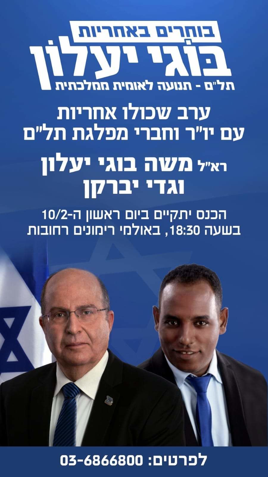 בוגי הערב ברחובות! הערב ראשון 10/2 ברחובות מפגן עוצמה של גדי יברקן המתמודד לכנסת ברשימת בני גנץ בכנס בהשתתפות שר הביטחון לשעבר משה בוגי יעלון