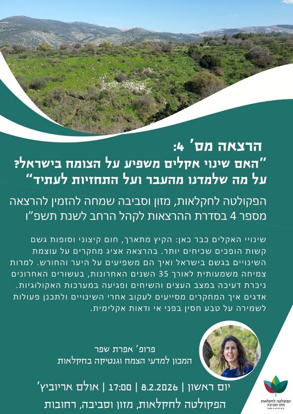 הפקולטה לחקלאות, מזון וסביבה של האוניברסיטה העברית ברחובות תקיים את ההרצאה הרביעית בסדרת ההרצאות הפתוחות לקהל הרחב. נושא ההרצאה יהיה "האם שינוי האקלים משפיע על הצומח בישראל?", והיא תעסוק בלקחים שנלמדו מהעבר ובתחזיות לעתיד.