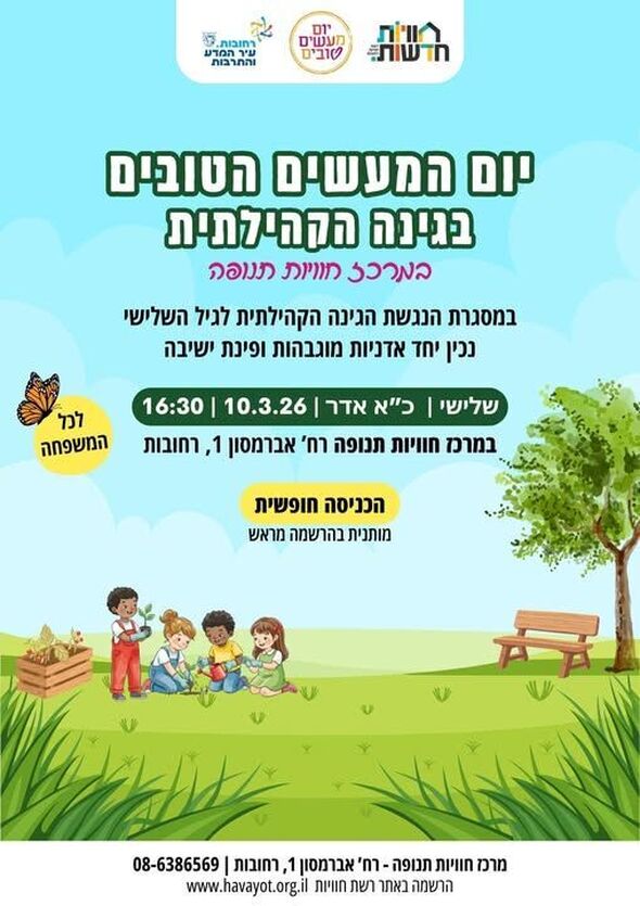 במסגרת יום המעשים הטובים, תתקיים פעילות מיוחדת בגינה הקהילתית של מרכז "חוויות תנופה". האירוע יוקדש לעבודה משותפת שמטרתה להתאים את הגינה לצרכי אוכלוסיית הגיל השלישי. הפעילות תתקיים ביום שלישי 10.3.26 בשעה 16:30