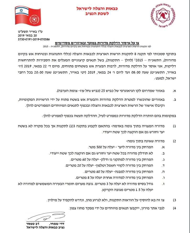 מפרסם נציב כבאות והצלה, רב טפסר דדי שמחי, צו מתוקף סמכותו לפי תקנה 8 לתקנות הרשות הארצית לכבאות והצלה על הגבלות לקיום מדורות לג בעומר.