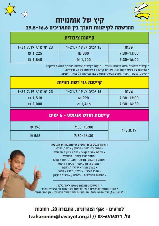 1-31.7.19, באותן שעות פעילות ובעלות של 1518 שקל ליום קצר ו- 2000 שקל ליום ארוך. הקייטנות יפעלו בין הימים ראשון לחמישי.