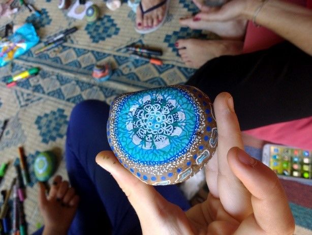 ציור ברוח המנדלה על חלוקי נחל ועלים בעבודה משותפת בהנחיית מתי רבד, אין צורך ברקע קודם בציור