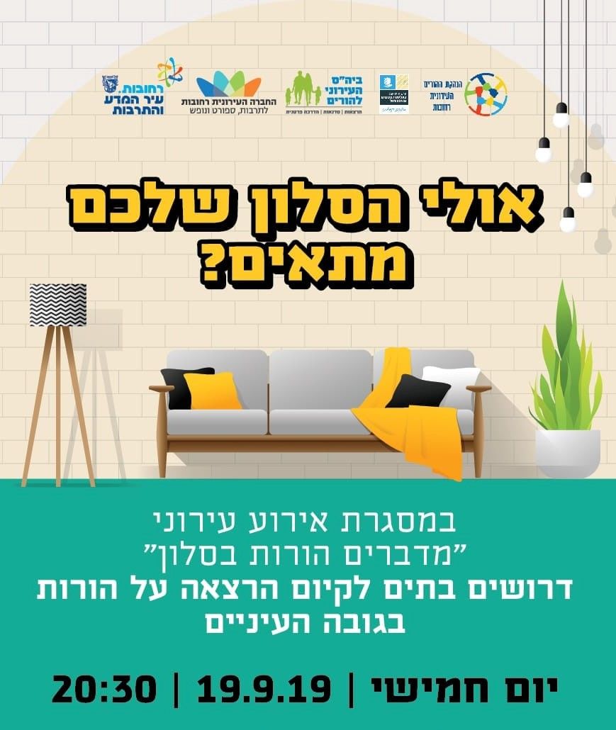 לראשונה ברחובות: "מדברים הורות בסלון"- 22 הרצאות מקצועיות להורים באווירה ביתית - ללא עלות, שיתקיימו ברחבי העיר ביום חמישי 19.9; יש לבצע הרשמה מראש . לפרטים 08-9459397