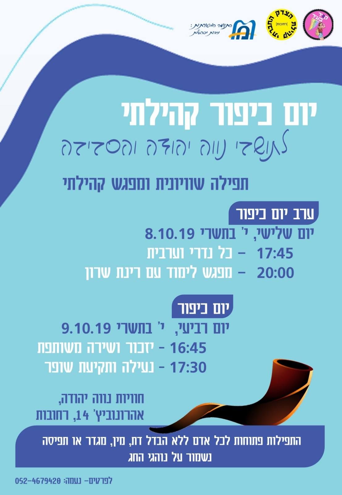 קהילת הצדק החברתי והתנועה המסורתית מזמינים את תושבי שכונת נווה יהודה למפגש ותפילה קהילתי שיתקיים במהלך יום הכיפורים. התפילות יערכו במרכז חוויות נווה יהודה, שיארח את התושבים לתפילות החג המשותפות מתוך כוונה ליצור ולאחד את הקהילה. מארגני האירוע מבהירים כי התפילות פתוחות לכל אדם ללא הבדל דת, מין, מגדר או תפיסה.