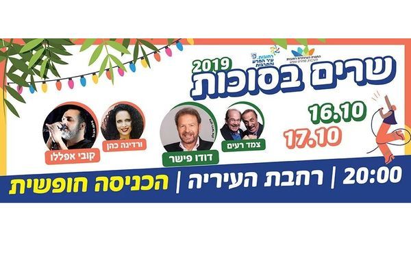 קובי אפללו, מופע מחווה ליוסי בנאי, סוכת ראש העיר ומטעמי החג מחכים לתושבי רחובות בפסטיבל שרים בסוכות שיתקיים במהלך חול המועד סוכות; כל הפרטים מצ"ב בכתבה http://www.be106.net/233/33168