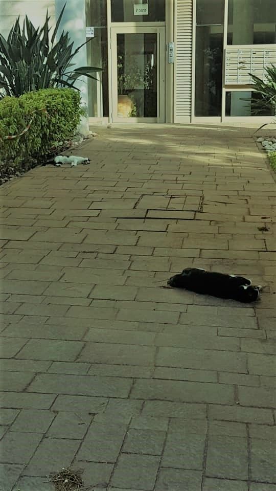 הבוקר חמישי 10/10 בסביבות השעה 08:00 נמצאו ברחוב הכרמל 7 ברחובות בפתח הבניין 2 חתולים מתים זה לצד זה כנראה מהרעלה. אחד אחד מהם שחור ומעט כתמים לבנים חתול גדול במיוחד וגם שמן, חתול שני נראה צעיר בגודל סטנדרטי לבן עם כתמים שחורים.