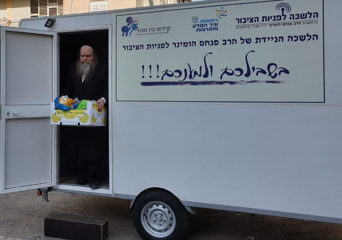 חבר המועצה פנחס הומינר מחסידות קרעטשניף הגיע לפני החג יחד עם הקרוואן שלו לקרית משה ולשכונות נוספות וחילק מצרכים למשפחות נזקקות