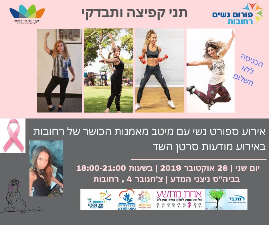 נשות רחובות מוזמנות לאירוע מודעות לסרטן השד "תני קפיצה ותיבדקי", שיתקיים ביום שני 28.10 בביה"ס ניצני המדע; המשתתפות ייהנו מאימונים ושיעורי ספורט של מיטב המדריכות והמאמנות של רחובות