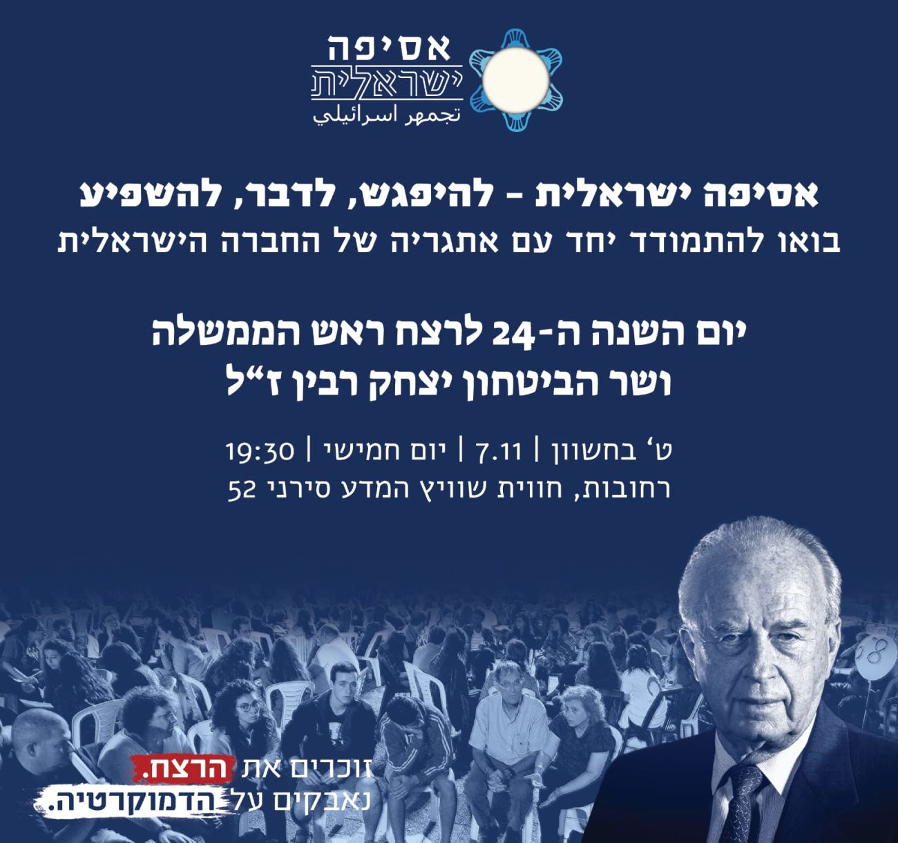 תתקיים האסיפה הישראלית – מפגש עם התושבים בו יערכו מפגשי שיח קהילתיים. האירוע מתקיים על ידי אסיפה ישראלית- קואליציית "זוכרים את הרצח – נאבקים על הדמוקרטיה", ששמה לנגד עיניה לשים את רצח רבין כתמרור אזהרה לחברה הישראלית. הקואליציה מורכבת מתנועות , אירגונים ואזרחים מכל קצוות החברה הישראלית כמו קק"ל, בת עמי, תנועות נוער ועוד.