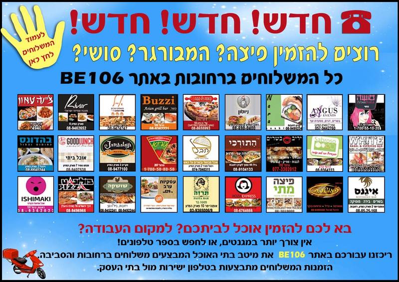 אתר ב106 ממשיך בחידושים ובהרחבת השירות לגולשים ברחובות ורכזנו את כ – 30 עסקים בתחום המזון המהיר המספקים שירות משלוחים של אוכל ברחובות והסביבה.