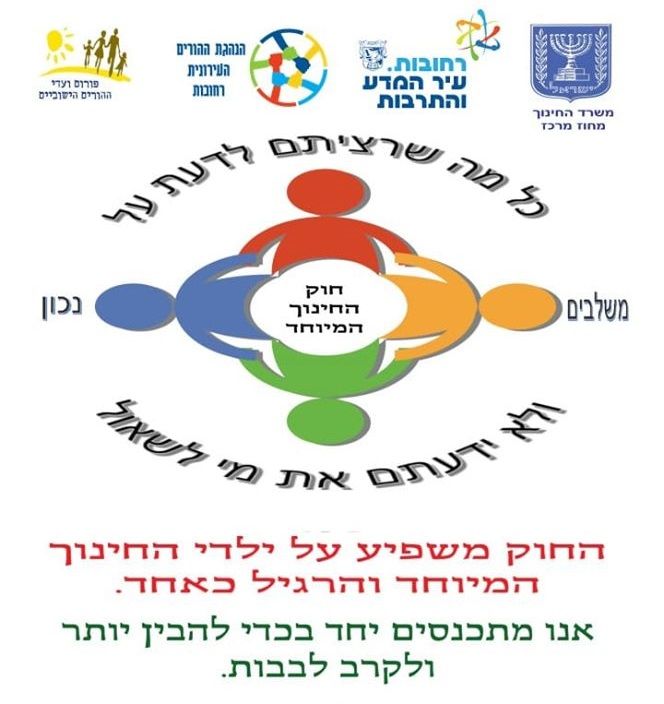 לידיעת ההורים! משרד החינוך והנהגת ההורים מזמינים את ההורים לשיח פתוח בנושא הכלת השינויים בחוק החינוך המיוחד בחודשים הקרובים במערכת החינוך; המפגש יתקיים ביום ראשון 8.12 בביה"ס למדעים רחובות
