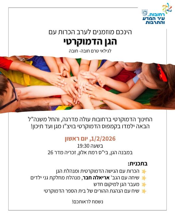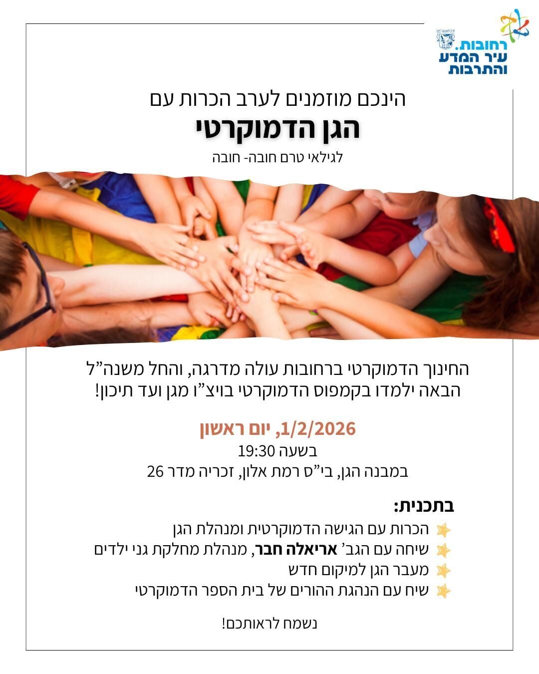 כחלק מההיערכות למהלך, יתקיים ערב פתוח ביום ראשון הקרוב, ה-1.2.26, בשעה 19:30. האירוע ייערך במיקומו הנוכחי של הגן הדמוקרטי, בבית הספר רמת אלון, ברחוב זכריה מדר 26 ברחובות.