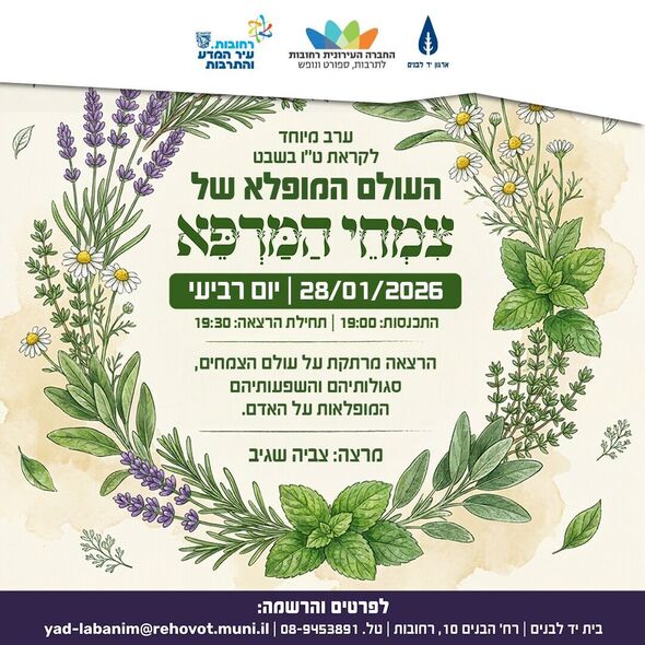 באולם בית יד לבנים ברחובות תתקיים הרצאה מרתקת תחת הכותרת "העולם המופלא של צמחי המרפא". ההרצאה תעסוק בעולם הצמחים, סגולותיהם והשפעותיהם על האדם, ותועבר על ידי המרצה צביה שגיב.