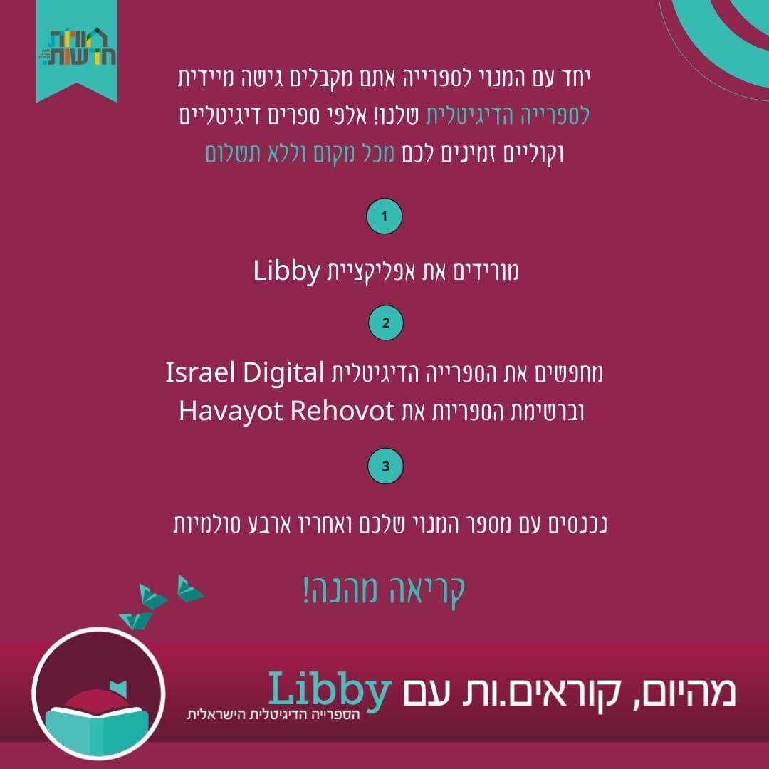 דרך הטלפון הנייד: יש להוריד את אפליקציית Libby, לבחור ברשימת הספריות את Havayot Rehovot, ולהקליד את מספר המנוי בתוספת ארבע סולמיות (####).