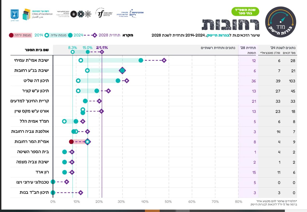 רשת ערי מצוינות פרסמה את דוח המצוינות השנתי לשנת הלימודים תשפ"ד, המציג את תמונת המצב של החינוך המדעי-טכנולוגי בישראל. העיר רחובות מתברגת בצמרת הרשויות הגדולות עם נתון מרשים של זכאות לבגרות הייטק.