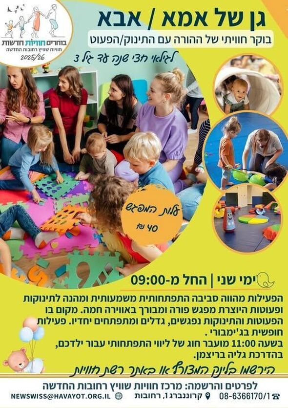 מרכז חוויות שוויץ ברחובות החדשה יקיים את פעילות "גן של אמא/אבא". האירוע מתוכנן להתקיים ביום שני, ה-9.2.26.