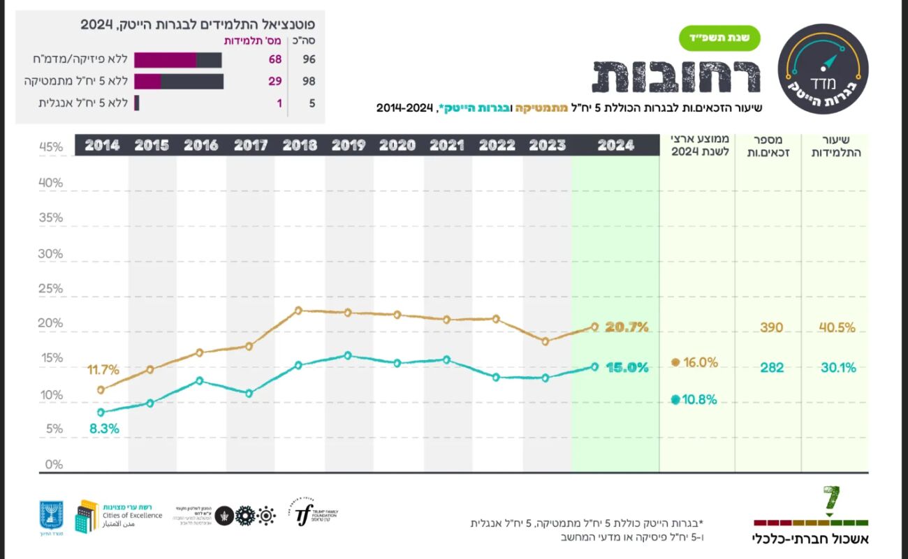 רשת ערי מצוינות, שהוקמה ביוזמת קרן טראמפ ובניהול המכון לשלטון מקומי באוניברסיטת תל אביב, פרסמה השבוע את דוח המצוינות השנתי. הדוח בוחן את שיעור הזכאים ל'בגרות הייטק', הכוללת 5 יחידות לימוד במתמטיקה, אנגלית ומדעי המחשב או פיזיקה. הנתונים מתייחסים לשנת הלימודים תשפ"ד (2023-2024), שנה שנפתחה בצל אירועי ה-7 באוקטובר.