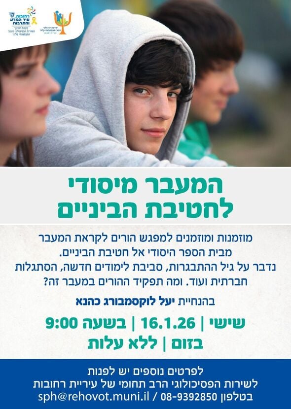 השירות הפסיכולוגי הרב תחומי של עיריית רחובות מזמין את ההורים למפגש מיוחד לקראת המעבר של ילדיהם מבית הספר היסודי אל חטיבת הביניים.