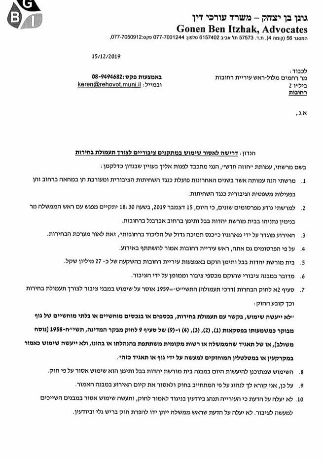 יש לדעת כי חוק הבחירות אוסר שימוש במתקנים ציבוריים לטובת מערכת בחירות.