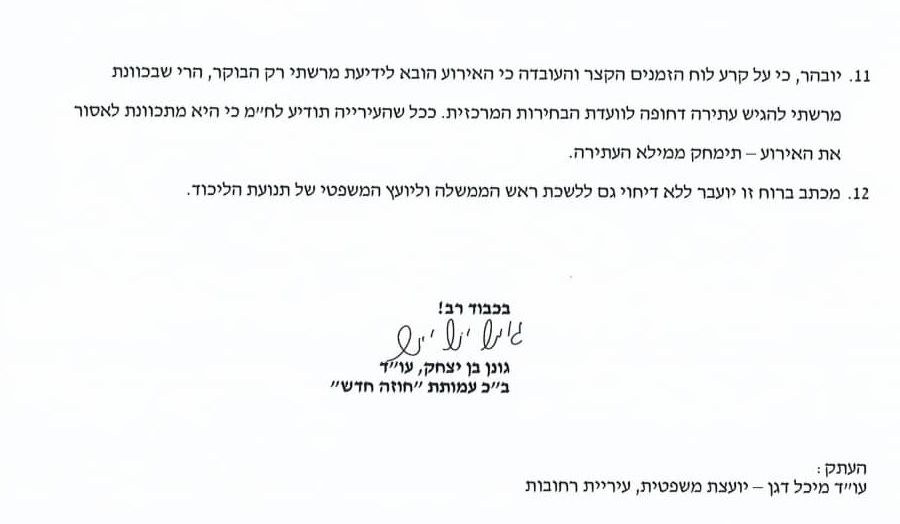 להלן מכתביו של עו"ד גונן בן יצחק אל ראש העיר רחמים מלול