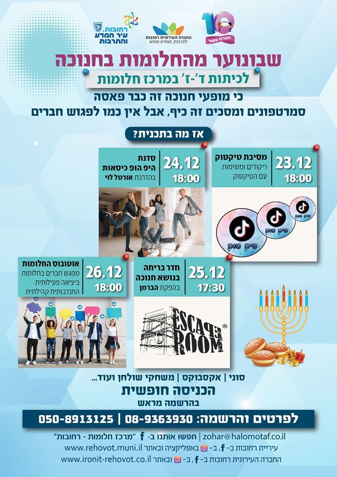 במרכז חלומות יתקיימו לילדי כיתות ד-ז אירועי חנוכה עם חדר בריחה, מסיבת טיק טוק, סדנת היפ הופ ועוד החל מיום שני 23/12; פירוט האירועים מצ"ב בכתבה http://www.be106.net/233/34605