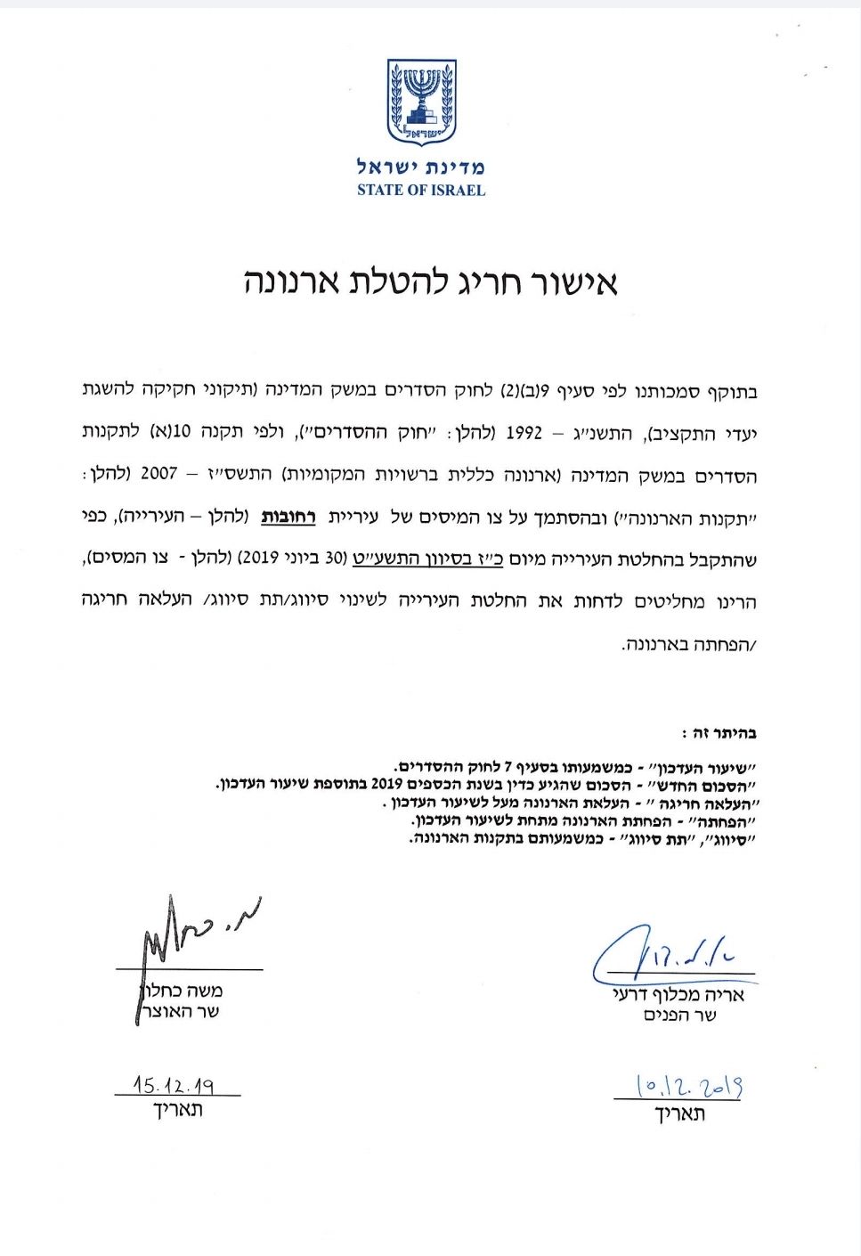 להלן הודעת שר הפנים והאוצר לעיריית רחובות על דחיית הבקשה לאישור חריג להטלת ארנונה