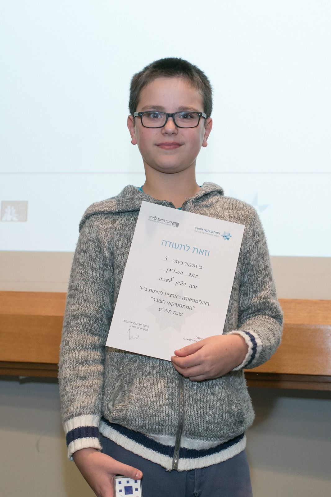 יואב הוברמן, תלמיד כיתה ו' בבית ספר ממ"ד תחכמוני, זכה בציון לשבח בכיתות ו'